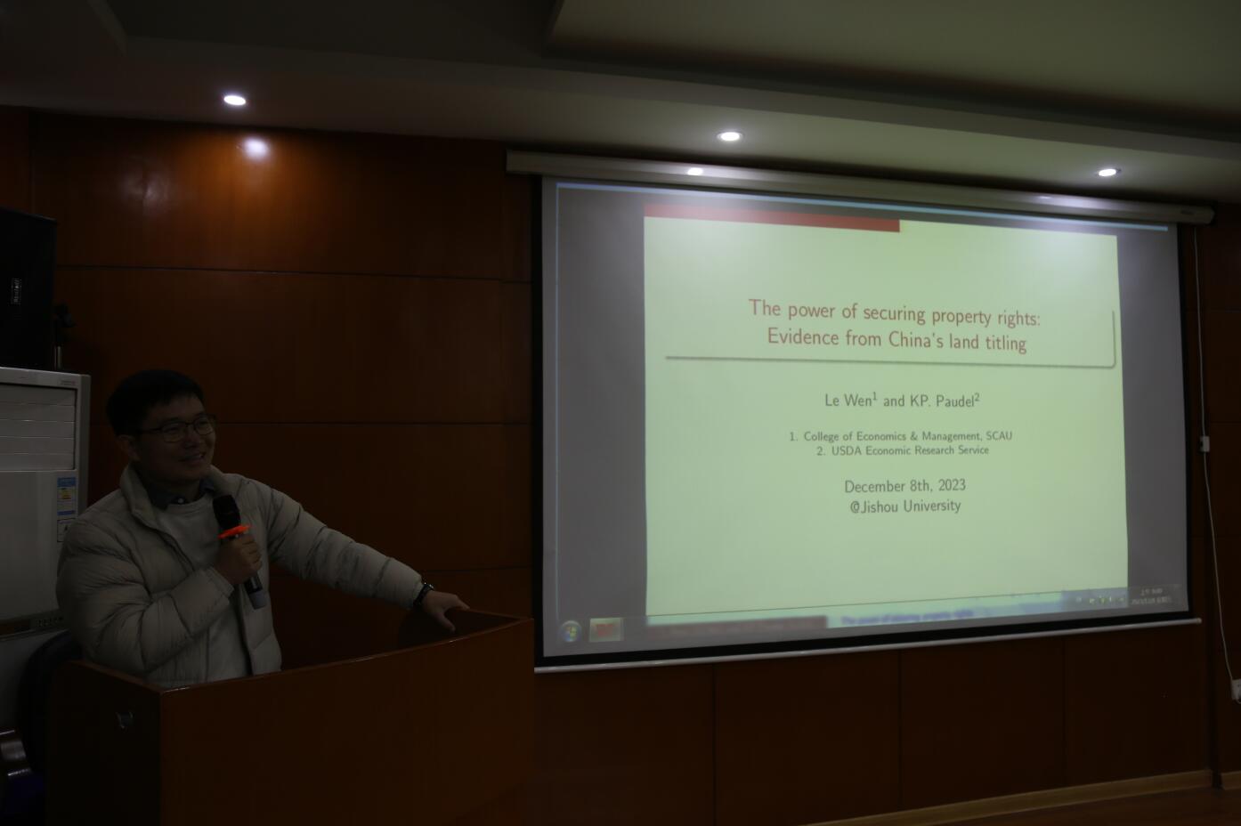 12月8日上午,华中科技大学经济学博士文乐副教授受邀参加我院举办的“风雨湖大讲堂”学术沙龙,为师生们带来主题为“保障产权的权力:来自中国土地所有权的证据”的学术讲座。本次讲座由院长丁建军主持,部分老师以及2022级研究生参加了本次学术讲座。