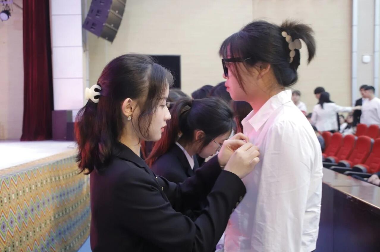 在佩戴校徽仪式上,学院老生代表队伍整齐划一,面带笑容地为2023年入学新生逐一佩戴校徽。 “kaiyun开云官方网站欢迎你”、“希望你们能学有所成”,老生一句句暖心的话语,让新生倍感温暖。校徽在胸,重任在肩,戴上校徽的那一刻,就成为了kaiyun开云官方网站的一员,希望让全体新生秉承“以人名校,以业报国”的校训,传承“凤飞千仞,薪传八方”的精神,争做一名合格的大学生!