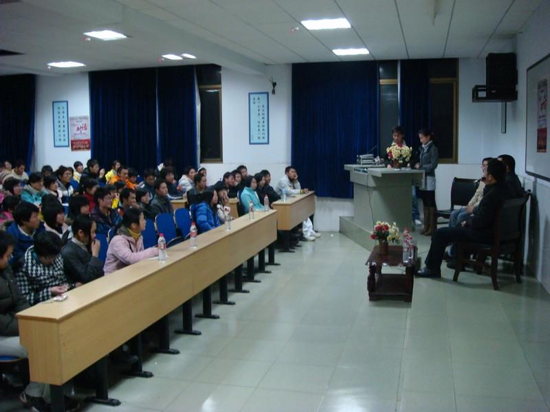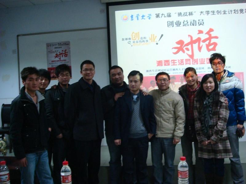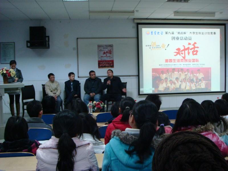 2009年12月11日晚,我院团总支在砂子坳校区举办“创业大赛赛前经验交流会暨动员大会”。本次交流会采取对话的方式,对话由范宇主持,并邀请了湘西生活网的四位主要负责人李跃华、邹武华、张杨、颜亮,商学院团总支书记周琴等老师参加了大会。