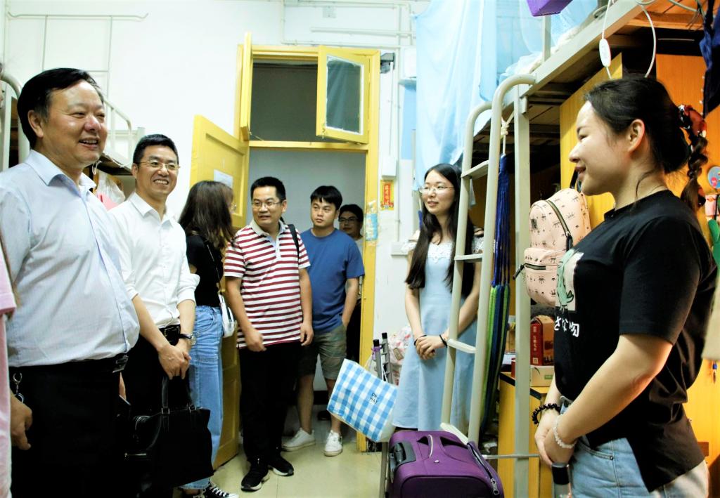 为更好的了解毕业生返校情况,确保学院2019届毕业生安全文明离校,5月27日下午,我院党委书记黎克双、副书记胡锦湘、主持工作副院长丁建军、辅导员陈洁、袁梓翔、张湘华、田惠深入砂子坳校区学生寝室,看望慰问返校毕业生。