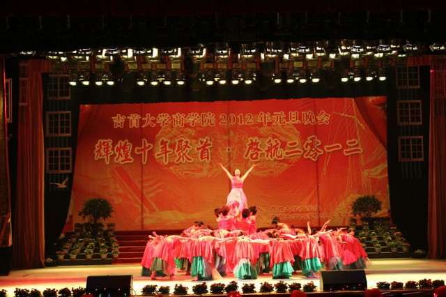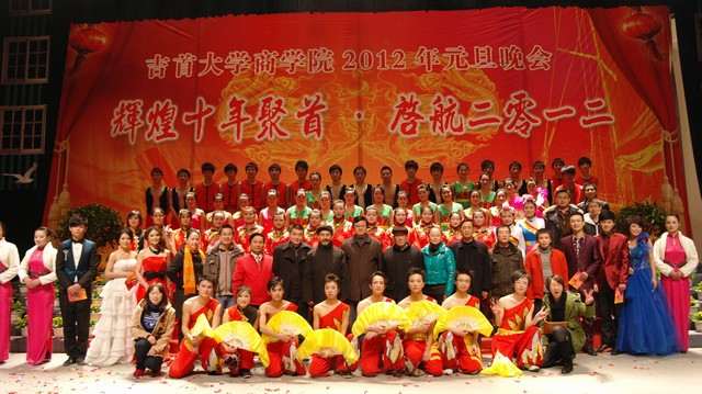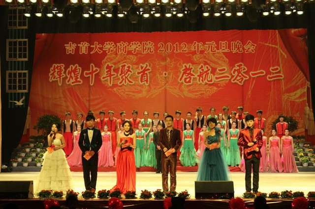 晚会由“龙腾虎跃闹新春,欢天喜地新十年”、“回顾历史,讴歌成就”、“美好蓝图,现在描绘”、“愿乘长风,破万里浪”四个篇章组成。喜庆的舞蹈《欢庆佳节》;具有浓厚革命气息的〈〈红旗颂〉〉、〈〈革命歌曲串烧〉〉;以商学院的发展历程为内容的诗歌朗诵〈〈岁月如歌——十年我们在一起〉〉;环保T台秀〈〈低碳生活,低碳婚礼〉〉;别具特色的小品〈〈寝室一家亲〉〉和相声〈〈我的大学生活〉〉;商务礼仪表演〈〈聂总的胖胖公司〉〉等形式多样的节目为观众创造了一个又一个的京戏,使得现场掌声不断。特别是我院离退办李泽南老师带来的《革命人永远是年轻》更是将整场气氛推向高潮。