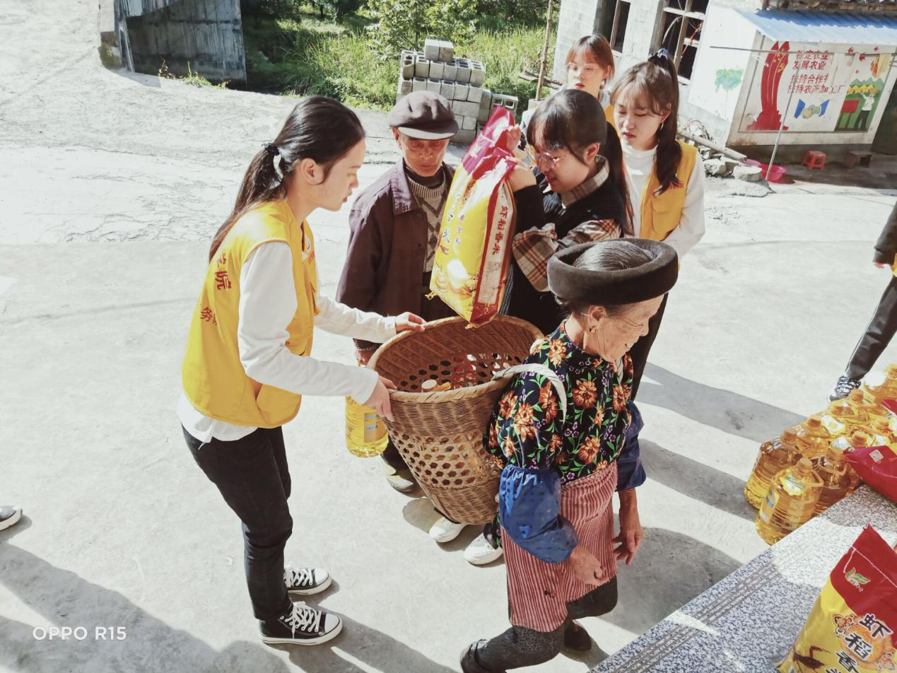 到达村部后,在村干部的协助下,灯塔志愿服务队为该村80岁以上的老人送上了米、油等重阳节慰问物资,对于部分行动不便的老人,灯塔志愿服务队的队员们积极主动帮忙把慰问物资送到他们家中。